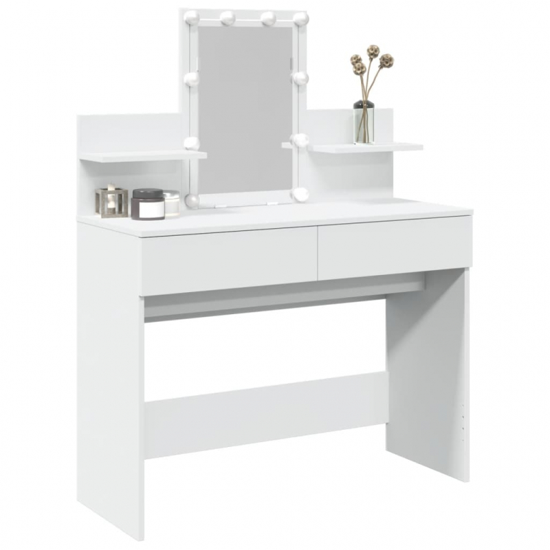 Dieser Schminktisch ist eine großartige Ergänzung zu deinem Schlafzimmer und bietet auch Platz zur griffbereiten Aufbewahrung deiner Kosmetika! Starkes und langlebiges Material: Holzwerkstoff ist ein langlebiges und robustes Material mit einer glatten Oberfläche, das gegen Feuchtigkeit, Verformung und Rissbildung beständig ist, wodurch es eine zuverlässigen Wahl für die Herstellung von Möbeln ist.Viel Stauraum: Der Schminktisch mit 2 Schubladen und 2 Ablagen bietet viel Platz, um verschiedene Alltagssachen gut organisiert und in Reichweite aufzubewahren.Allzweckspiegel: Der schöne Spiegel bietet eine klare Sicht beim Auftragen von Make-up und verleiht dem Schminktisch eine elegante Note.LED-Leuchten: Der Schminktisch verfügt auch über LED-Leuchten mit USB, die einfach von Warmweiß auf Kaltweiß umgeschaltet werden können. Dabei beleuchten die LED-Lampen rund um den Spiegel dein Gesicht optimal. Achtung:Um ein Umkippen zu vermeiden, sollte dieses Produkt mit der mitgelieferten Wandhalterung gesichert werden.