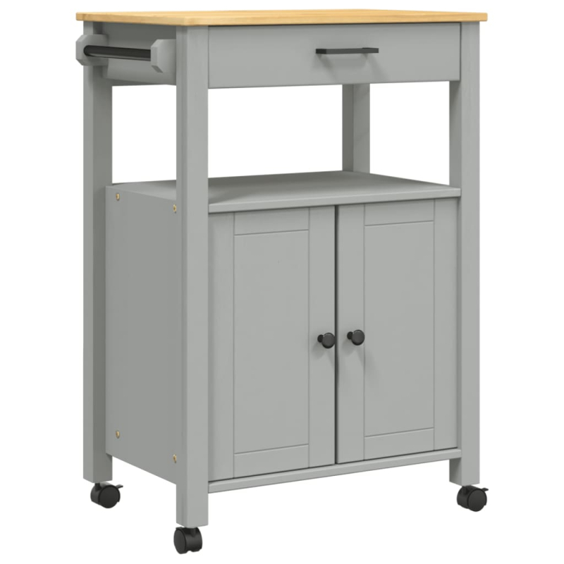 Dieser Küchenwagen aus Holz verleiht deiner Küche eine unverwechselbare Vintage-Note und schafft zusätzlichen Stauraum! Langlebiges Material: Kiefer-Massivholz ist ein wunderschönes Naturmaterial. Kiefernholz hat eine gerade Maserung und die Aststellen verleihen dem Material sein typisches, rustikales Aussehen. Aus Kiefer-Massivholz gefertigt, ist dieser Küchenwagen langlebig und robust. Viel Stauraum: Dieser Küchenwagen ist mit einer Schublade und 2 Türen ausgestattet und bietet dadurch reichlich Stauraum für Küchenutensilien. Auf der seitlichen Holzstange und den Metallhaken kannst du verschiedene Sachen griffbereit aufbewahren. Leicht zu bewegen: Dieser Servierwagen verfügt über 4 Räder, davon sind 2 feststellbar, sodass er sich jederzeit flexibel bewegen lässt und stabil steht. Vielseitige Anwendungsmöglichkeiten: Der Rollwagen kann in der Küche, im Wohnzimmer, im Badezimmer, im Arbeitszimmer und an anderen Orten verwendet werden. Du kannst hier deine Alltagsgegenstände, Gewürze, Toilettenartikel, Bücher und andere Dinge aufbewahren, um dein Zuhause aufgeräumt zu halten.