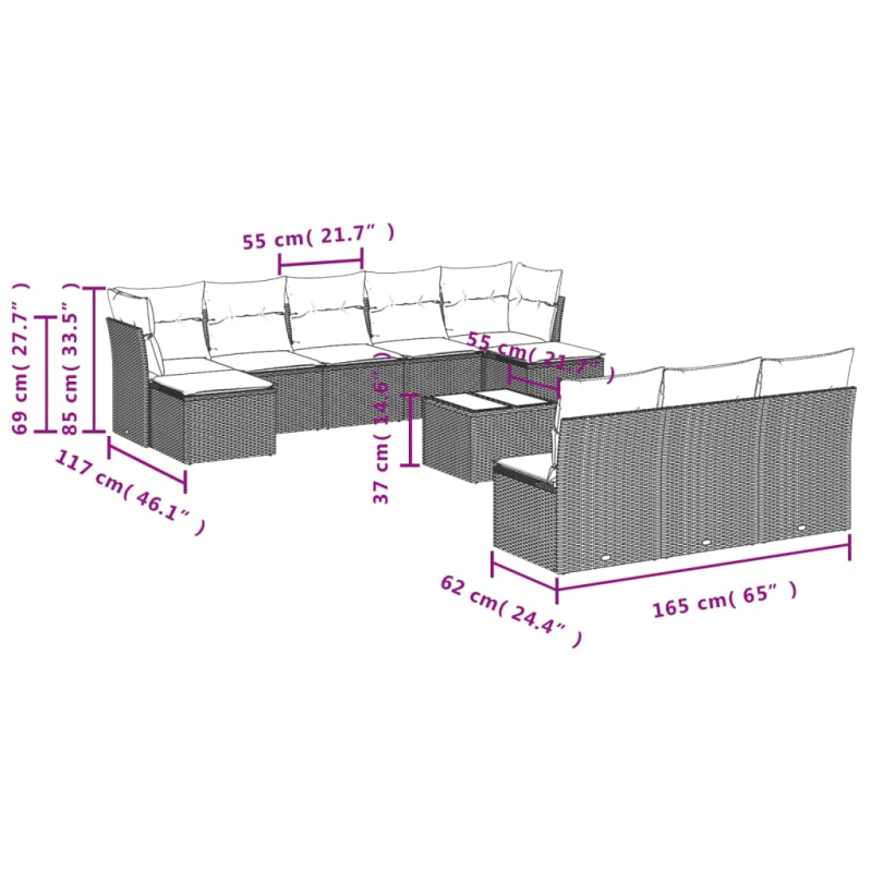 11-tlg. Garten-Sofagarnitur mit Kissen Braun Poly Rattan