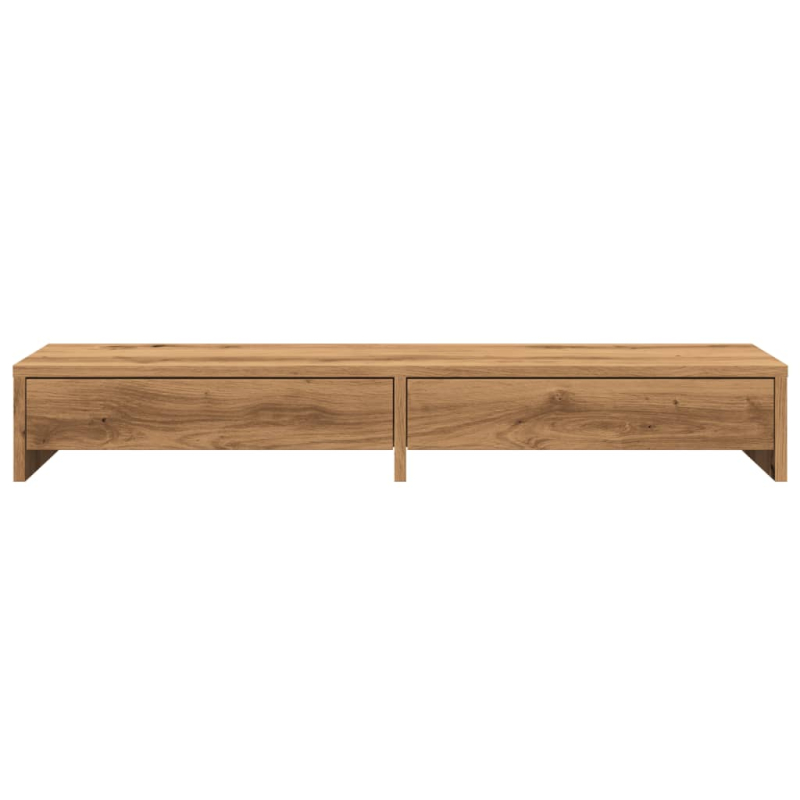 Optimiere deinen Arbeitsplatz mit unserem praktischen Doppel-Monitorständer, um mehr Betrachtungskomfort auf stilvolle Weise zu genießen! Starkes und langlebiges Material: Holzwerkstoff ist ein langlebiges und robustes Material mit einer glatten Oberfläche, das gegen Feuchtigkeit, Verformung und Rissbildung beständig ist; dadurch ist es eine zuverlässige Wahl für die Herstellung von Möbeln.Reichlich Stauraum: Der Bildschirmständer verfügt über 2 Schubladen und bietet dadurch reichlich Stauraum, um Bürobedarf ordentlich aufzubewahren und für mehr Ordnung auf deinem Schreibtisch zu sorgen.Pflegeleicht: Dank ihrer glatten Oberfläche lässt sich die Monitorerhöhung mit einem feuchten Tuch leicht reinigen und erfordert wenig Pflege.