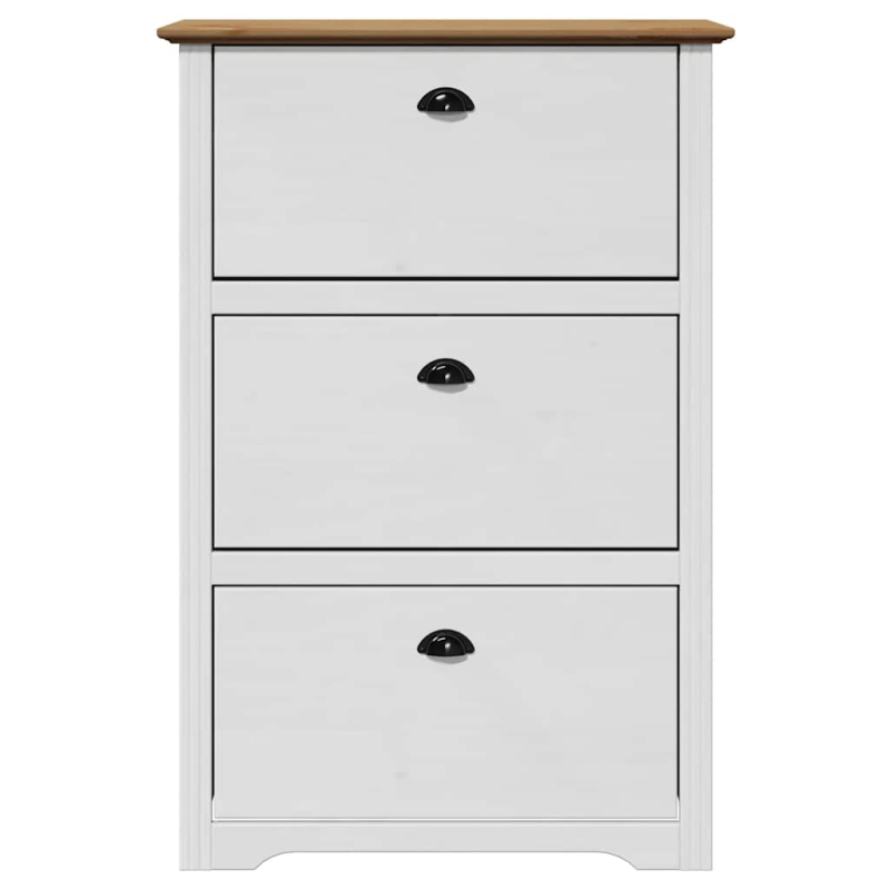 In diesem eleganten Schuhregal lassen sich Ihre Schuhe ganz ordentlich aufbewahren, um für ein aufgeräumtes Wohnumfeld zu sorgen! Langlebiges Material: Massives Kiefernholz ist bekannt für seine Stärke und Haltbarkeit. Seine geraden Maserungen und ausgeprägten Äste tragen zu seinem rustikalen Charme bei. Holzwerkstoff ist ein langlebiges und stabiles Material mit einer glatten Oberfläche, die resistent gegen Feuchtigkeit, Verformung und Rissbildung ist und sich daher für eine Vielzahl von Projekten eignet.Viel Stauraum: Der Schuhschrank verfügt über 3 Schubladen und bietet reichlich Platz für die Aufbewahrung von Schuhen. Mit diesem praktischen Schuhregal wirst du dich nie wieder über herumliegende Schuhe ärgern.Praktische Oberplatte: Die robuste Oberplatte eignet sich ideal, um Dekoartikel und Bilderrahmen zur Schau zu stellen oder Sachen wie Schlüssel oder Geldbörsen griffbereit aufzubewahren.Einfach zu bedienen: Die Metallgriffe der Schubladen ermöglichen ein bequemes Öffnen und Schließen und machen den Schuhschrank noch attraktiver.Pflegeleicht: Dank seiner glatten Oberfläche ist der Schuh-Organizer leicht zu reinigen und muss nur mit einem trockenen Tuch abgewischt werden. Gut zu wissen:Schrauben und Dübel für die Montage an der Wand sind nicht enthalten. Passendes Montagezubehör muss separat gekauft werden. Wenn du dir bezüglich der Montage nicht sicher bist, wende dich bitte an einen Fachmann. Bitte lies und befolge jeden Schritt in der Anleitung. Achtung:Um ein Umkippen zu vermeiden, sollte dieses Produkt mit der mitgelieferten Wandhalterung gesichert werden.