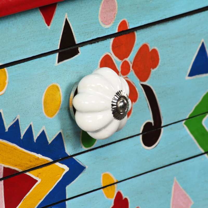 Dieser einzigartige Konsolentisch aus Holz verleiht deinem Wohn- oder Schlafzimmer eine farbenfrohe Note und ist überall ein echter Hingucker. Mit seinem markanten Design zieht dieser handbemalte Konsolentisch die Aufmerksamkeit deiner Gäste sofort auf sich. Dieser handgefertigte Tisch aus Mangoholz ist sowohl robust als auch schön anzusehen, die hochwertige Verarbeitung trägt zu seinem Vintage-Look bei. Der Tisch verfügt über reichhaltige, handbemalte dekorative Details - das macht ihn zum perfekten Möbelstück für Trendbewusste und Individualisten! Die markanten Griffe erleichtern das Öffnen der Schubladen und unterstreichen den einzigartigen Look dieses Konsolentisches. Der Konsolentisch verfügt über 4 Schubladen und bietet dadurch reichlich Platz, um verschiedene Sachen ordentlich aufzubewahren. Die farbenfrohe Tischplatte eignet sich ideal, um Dekoartikel wie Vasen, Bilderrahmen, Obstkörbe usw. zur Schau zu stellen. Der Zusammenbau ist kinderleicht.