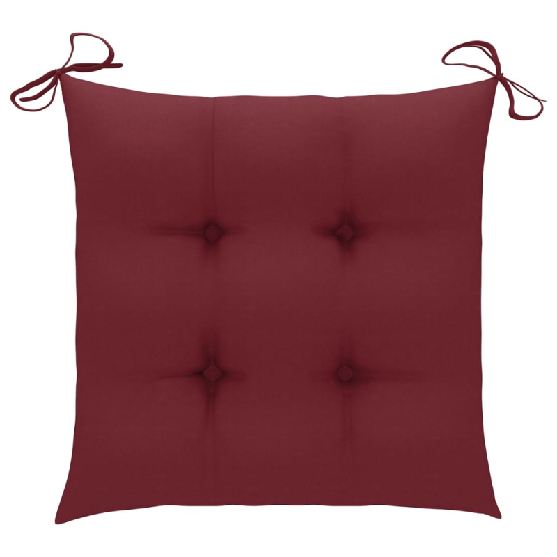Verleihen Sie Ihrem Esszimmer, Garten oder Ihrer Terrasse einen Hauch von rustikalem Charme mit diesem stapelbaren Gartenstuhl-Set aus Holz! Das Essstuhl-Set verleiht Ihrem Innen- oder Außenbereich mit seinem eleganten Design einen Hauch von Eleganz. Dieses Teakholz-Möbel besteht aus extrem haltbarem Teakholz, das abgelagert, künstlich getrocknet und fein geschliffen worden ist, um ein sehr glattes Aussehen zu erzielen. Teak wird für seine außergewöhnliche Festigkeit und Witterungsbeständigkeit geschätzt, wodurch es sich weitaus besser als jede andere Holzart für Gartenmöbel eignet. Teak ist die perfekte Wahl, wenn Sie ein langlebiges Gartenmöbel kaufen möchten. Es ist leicht zu pflegen und mit einem feuchten Tuch zu reinigen. Außerdem kann der Esszimmerstuhl gestapelt werden, um bei Nichtgebrauch Stauraum zu sparen. Darüber hinaus sorgen die mitgelieferten Kissen für zusätzlichen Komfort. Jedes Kissen hat 2 Sätze Bänder, um es fest am Stuhl zu befestigen. Hinweis: Um die Lebensdauer Ihrer Gartenmöbel zu verlängern, empfehlen wir Ihnen, diese regelmäßig zu reinigen und bei Nichtgebrauch im Freien abzudecken.Reinigung: Verwenden Sie eine milde SeifenlösungLagerung: Wenn möglich, an einem kühlen, trockenen Ort im Innenbereich lagern. Wenn das Produkt im Freien gelagert wird, schützen Sie es mit einer wasserdichten Abdeckung. Wischen und trocknen Sie das überschüssige Wasser oder den Schnee nach Regen oder Schneefall von der ebenen Fläche. Sorgen Sie für eine ausreichende Luftzirkulation, um feuchtigkeitsbedingte Schäden zu vermeiden.