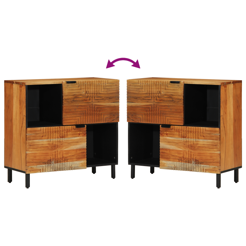 Dieser rustikale Medienlagerungsschrank aus Akazienholz bringt natürlichen Charme zusammen mit Praktikabilität. Seine stilvolle rechteckige Form und die schöne Holzmaserung machen ihn nicht nur zur Aufbewahrungslösung, sondern auch zu einem stylischen Hingucker für deinen Wohnraum, der deine Mediengeräte und Deko perfekt präsentiert. Die massive Akazienholz-Konstruktion sorgt für Langlebigkeit und hebt die schöne Holztextur hervor. Mit Platz, der durch zwei große Türen geboten wird, ist dieser Schrank perfekt zum Organisieren von Filmen, Spielen oder dekorativen Gegenständen - wirklich vielseitig! Das texturierte Holzdesign und das geometrische Muster geben einen künstlerischen Touch, der zu rustikalen oder modernen Stilen passt und ihn zum Hingucker macht. Zwei verstellbare Regale bieten flexible Stauraumlösungen für verschiedene Größen von Dingen. Die mit Wachs behandelte Oberfläche sieht nicht nur gut aus, sondern schützt auch und erleichtert die Pflege.