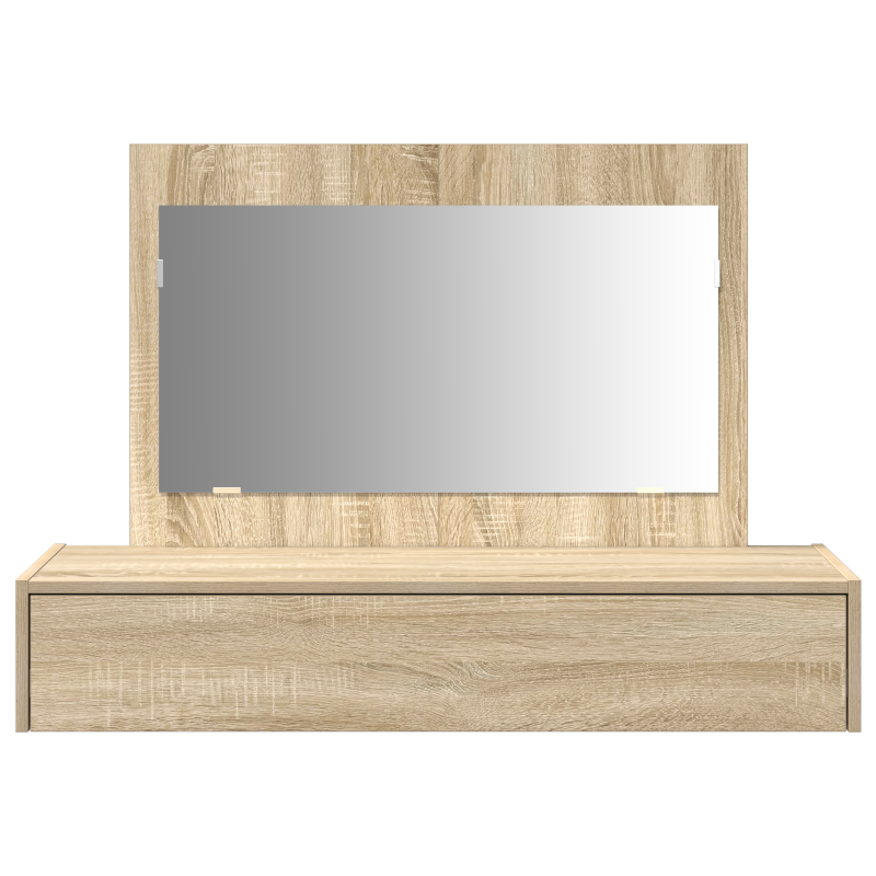 Dieser wandhängende Schminktisch bringt modernes Design und praktische Nutzung zusammen und ist eine tolle Ergänzung für jedes Schlafzimmer oder jeden Pflegebereich. Mit seinem eleganten Sonoma Eichenfinish und dem schlichten Design ist er nicht nur ein Hingucker, sondern erfüllt auch alle deine täglichen Pflegebedürfnisse. Das wandmontierte Design spart Platz und hält alles ordentlich, während du einfachen Zugang zu deinen Beauty-Essentials hast. Eine große traditionelle Schublade sorgt dafür, dass alles schön organisiert bleibt, damit deine Kosmetik und Kleinigkeiten nicht im Chaos untergehen. Der Flachspiegel hilft dir, gut auszusehen, und bringt natürliches Licht in den Raum. Hergestellt aus hochwertigem Holzwerkstoff, ist der Schminktisch nicht nur hübsch, sondern darauf ausgelegt, lange zu halten und bleibt über die Jahre schön. Mit einer Länge von 100 cm, einer Breite von 40 cm und einer Höhe von 70 cm hat er die perfekte Größe für die Nutzung und passt super zu verschiedenen Raumkonzepten.