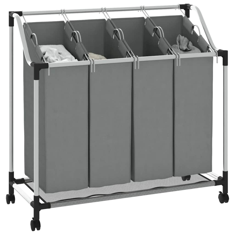 Dieser Wäschekorb mit Rollen ist die ideale Wahl, um deine Wäsche aufzubewahren und zu sortieren, was dein Leben einfacher und bequemer macht. Robuste Struktur: Das Gestell des Wäschekorbs besteht aus Stahl mit einer Kunststoffbeschichtung, was ihn robust, rostfrei und langlebig macht.Reichlich Stauraum: Dieser Wäschekorb verfügt über 4 Wäschesäcke, in denen du deine Wäsche nach Farbe und Material sortiert aufbewahren kannst. Das sorgt für Ordnung und spart dir Zeit.Abnehmbares Design: Der Wäschekorb ist mit Klettverschlüssen ausgestattet, sodass er je nach Bedarf leicht verschoben oder befestigt werden kann. Außerdem sorgen die abnehmbaren oberen Stützstangen für eine flexible Nutzung.Leicht zu bewegen: Dieser Wäschekorb kann mit den vier mitgelieferten Schwenkrollen leicht an den gewünschten Ort bewegt werden. Die beiden Rollen mit Bremsen halten den Korb in Position und sorgen für zusätzliche Stabilität.Erhöhtes Design: Dank seines erhöhten Designs hält dieser Wäschekorb deine Wäsche vom Boden fern, fördert eine bessere Luftzirkulation, um Feuchtigkeitsansammlungen zu vermeiden, und macht sie leichter zugänglich.