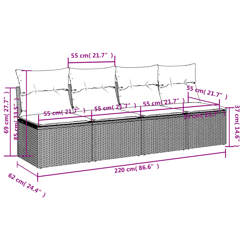 Entspanne dich und genieße die Natur auf diesem bequemen 4-Sitzer-Gartensofa! Langlebiges Material: PE-Rattan, auch als Poly Rattan bekannt, ist ein robustes, pflegeleichtes synthetisches Material, das die Optik von natürlichem Rattan aufweist. Es kennzeichnet sich durch ein geringes Eigengewicht und lässt sich einfach reinigen. Aufgrund seiner Haltbarkeit und Witterungsbeständigkeit wird es häufig bei der Herstellung von Gartenmöbeln verwendet.Bequemes Sitzerlebnis: Dieser Gartensessel mit dick gepolsterten Kissen bietet ein angenehmes Sitzgefühl.Abnehmbarer und waschbarer Bezug: Diese Sitzkissen verfügen über abnehmbare Bezüge für einfaches Waschen und Pflegen.Modulares Design: Dank des modularen Designs lassen sich die Gartenmöbel völlig flexibel und einfach umstellen, um deinen Außenbereich ganz individuell zu gestalten. Gut zu wissen:Wir empfehlen dir, deine Gartenmöbel mit einer wasserdichten Hülle zu schützen, um lange Zeit eine ansprechende Optik aufzuweisen.