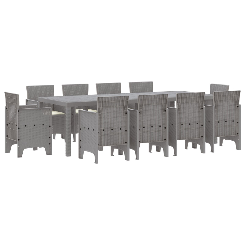 Dieses Garten-Esszimmer-Set ist perfekt fr alle, die gerne drauen essen! Es hat ein groes Layout, ideal fr Familientreffen oder Partys. Das strapazierfhige synthetische Poly-Rattan hlt verschiedenen Wetterbedingungen stand, sodass du fr jede Jahreszeit gut gerstet bist. Das Set kommt mit einem groen rechteckigen Tisch und zehn bequemen Sthlen, die fr alle genug Platz bieten. Die schicke hellgraue Oberflche verleiht deinem Auenbereich einen modernen Touch. Nutze es auf deinem Balkon, deiner Terrasse oder deinem Deck fr gesellige Stunden im Freien. Ideal fr Sommerunterhaltung; mit diesem Set machst du deinen Auenbereich zum beliebten Treffpunkt fr Freunde und Familie. Zudem sind die Sthle sofort einsatzbereit, also kannst du direkt loslegen und dein neues Set genieen.