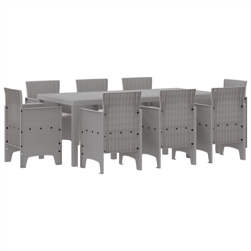 Dieses Garten-Essset kombiniert Stil und Funktionalität, perfekt für gesellige Treffen, Familienessen oder entspannte Nachmittage auf der Terrasse. Mit seinem großzügigen Design finden bis zu acht Personen rund um den modernen rechteckigen Tisch Platz und schaffen so eine einladende Atmosphäre. Geräumige Sitzplätze: Platz für bis zu acht Personen, ideal für Familienfeiern und Zusammenkünfte. Alle können zusammen essen und die Zeit genießen. Haltbarkeit: Aus UV-beständigen Materialien hergestellt, bleibt das Set langlebig und behält sein frisches Aussehen. Wetterbeständig und ideal für wechselnde Jahreszeiten. Einfache Pflege: Glatte Oberfläche aus synthetischem Kunststoff kann einfach mit einem feuchten Tuch gereinigt werden – mehr Zeit zum Genießen und weniger Zeit für die Reinigung! Stylisches Design: Modernes Aussehen, das in jede Außenumgebung passt, von Gärten bis Terrassen. Die helle graue Farbe bringt einen zeitgemäßen Touch und fügt sich harmonisch in die Natur ein, ideal für Mahlzeiten im Freien. Bequeme Sitzgelegenheiten: Jeder Stuhl hat ein abnehmbares Kissen mit Reißverschluss. Dieses Detail sorgt für Komfort und eine angenehme Zeit für alle.