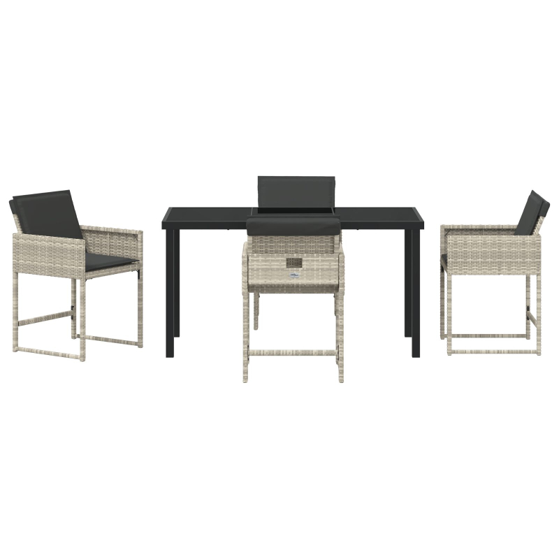 Das Garten-Dining-Set ist eine coole Mglichkeit, drauen zu essen und modernen Flair mit Komfort zu verbinden. Es bietet Platz fr bis zu vier Personen, perfekt fr kleinere Treffen im Garten oder auf der Terrasse. Hergestellt aus robustem Poly-Rattan hlt dieses Gartenmbel allen Wetterbedingungen stand und sieht dabei toll aus. Die Kissenbezge sind leicht abnehmbar und waschbar, sodass die Reinigung einfach geht. Mit der trendigen Farbkombination aus Hellgrau und Anthrazit ist dieses Set nicht nur zum Essen da; es ist ein Ort fr schne Erinnerungen.