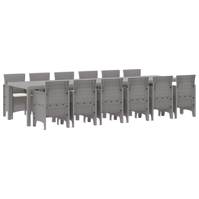 Hol dir das beste Outdoor-Ess-Erlebnis mit diesem 13-teiligen Garten-Essgruppe! Aus langlebigem, hellgrauem Poly-Rattan, sieht es klasse aus und passt perfekt für Terrassen, Balkone oder Gärten bei all deinen geselligen Zusammenkünften. Platz für bis zu 12: Diese Essgruppe hat Platz für 12 Gäste, ideal für Familienessen oder wenn Freunde zu Besuch sind. UV-beständig: Dank der UV-beständigen Materialien widersteht dieses Set dem Verblassen durch die Sonne und behält seine Farben lebendig. Robustes Material: Aus robustem Poly-Rattan gefertigt, hält das Set den Wetterbedingungen im Freien stand und sorgt für Komfort und Stabilität. Stylischer Look: Das schicke Design mit klaren Linien und strukturierter Oberfläche fügt sich perfekt in verschiedene Außenstile ein und bereichert deinen Außenbereich. Einfach zu pflegen: Das Set bleibt sauber; einfach den Schmutz abbürsten, wenn er trocken ist, und bei Nichtgebrauch abdecken für zusätzlichen Schutz.
