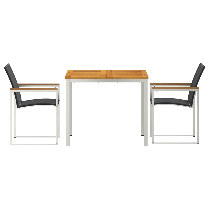 Dieses Garten Essset ist genau das Richtige, um draußen zu essen. Es hat einen kompakten Latten-Tisch und zwei stylishe Stühle. Das Set vereint Massivholz-Akazie mit einem stabilen pulverbeschichteten Metallrahmen und bringt dadurch einen eleganten, aber auch praktischen Eindruck in jeden Balkon- oder Gartenbereich. Dieses Garten Essset kombiniert natürliches Holz mit modernem Stil und ist ein ganz besonderes Stück für deine Outdoor-Entspannung. Die robuste Konstruktion sorgt dafür, dass die Möbel unterschiedliche Wetterbedingungen überstehen, sodass du sie viele Jahre lang nutzen kannst. Die Textilene-Stoffsitze der Stühle bieten Komfort und Unterstützung, damit du entspannt draußen essen kannst, besonders an warmen Tagen. Die quadratische Form spart Platz und passt perfekt in kleinere Außenbereiche, ohne Abstriche bei Stil oder Funktionalität zu machen. Das Set eignet sich hervorragend für Mahlzeiten mit Freunden oder Familie und macht jede Mahlzeit besonders, egal ob im Garten, auf dem Balkon oder der Terrasse.