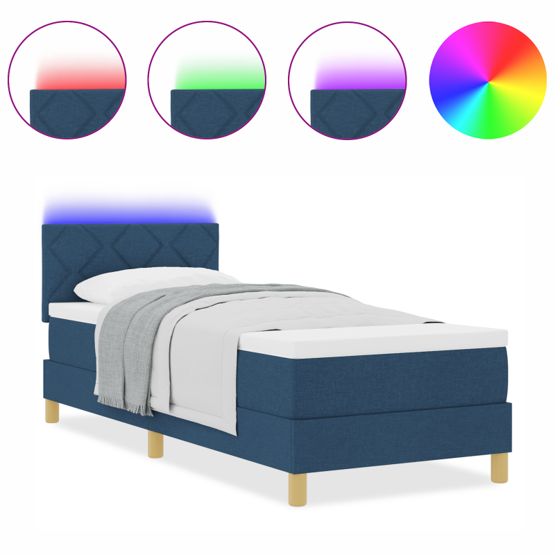 Dieses Boxspringbett ist ideal für eine Person und bietet erstklassigen Komfort in einem stylischen Look. Mit seinem modernen Stoff und den integrierten LED-Lichtern wird jedes Schlafzimmer zu einem entspannenden Rückzugsort, der Stil mit Praktikabilität verbindet. Integrierter LED-Streifen: Das Design hat einen integrierten LED-Streifen für eine fantastische Stimmung im Schlafzimmer und macht es zu einem besonderen Stück. Atmungsaktives Material: Hergestellt aus weichem Polyester, bleibt das Bett bequem und frisch für eine gute Nachtruhe. Stylisches Design: Mit rechteckiger Form und blauem Finish bringt das Boxspringbett moderne Eleganz mit einem Diamantblockmuster, das perfekt in jedes Schlafzimmer passt. Einfache Pflege: Die Reinigung ist ganz einfach, einfach mit einem trockenen Tuch drüberwischen, damit du mehr Zeit zum Entspannen hast. Stabil und sicher: Robuste Beine aus natürlichem Holz sorgen für Stabilität und Langlebigkeit – ideal für Erwachsene, die langlebige Möbel suchen.