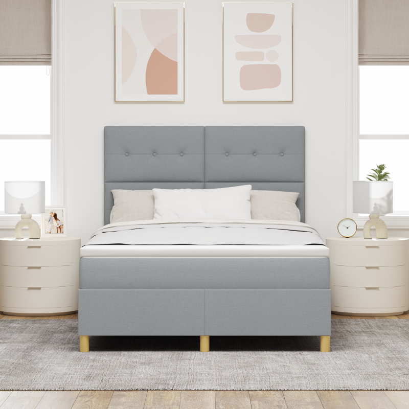 Der hellgraue, knopfgepolsterte Bettrahmen ist eine Mischung aus Stil und Funktionalität für dein Schlafzimmer. Er schafft eine ruhige, elegante Schlafumgebung. Mit seinem weichen Stoff, dem stabilen Holzrahmen und der bequemen Polsterung ist er der perfekte Ort zum Entspannen und verleiht deinem Raum einen modernen Touch. Bequeme Unterstützung: Dieser Bettrahmen bietet weichen Stoff, an den du dich anlehnen kannst; perfekt zum Entspannen oder Lesen vor dem Schlafen. Stylische Optik: Mit Knopfpolstern und hellgrauer Farbe bringt er einen Hauch von Eleganz in dein Schlafzimmer und bleibt dabei im Trend. Platzsparendes Design: Das wandmontierte Design schont Platz, sieht gut aus und ist ideal für kleinere Wohnungen. Einfache Pflege: Der Stoff lässt sich leicht punktuell reinigen, sodass dein Bett frisch bleibt. Ideal für jeden: Ob Paar oder alleine – dieser Bettrahmen bietet tollen Platz für zwei und passt zu verschiedenen Lebensstilen.