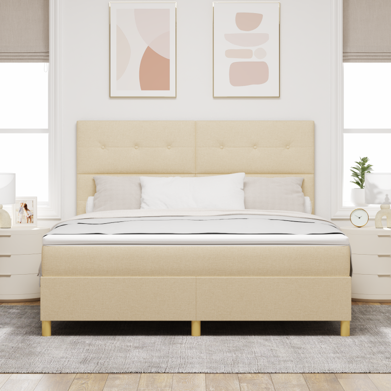 Dieser Bettrahmen vereint modernes Design mit praktischen Features und ist eine super Wahl für jedes Schlafzimmer. Das flauschige Kopfteil mit Knopfheftung sorgt für eine stilvolle Atmosphäre und ist perfekt, um zu entspannen. Stylische Ästhetik: Der Kopfteil mit Knopfheftung fügt sich gut in moderne Räume ein und verleiht deinem Schlafzimmer einen Hauch von Luxus. Robuste Konstruktion: Built mit stabilen Holzbeinen, bietet dieser Bettrahmen zuverlässige Haltbarkeit und trägt mühelos zwei Personen, perfekt für Paare. Weiches Stoffmaterial: Überzogen mit weichem, angenehmen Stoff sorgt dieser Rahmen für Komfort und Eleganz und lädt zum Entspannen nach einem langen Tag ein. Einfache Pflege: Die Materialien erlauben eine schnelle Reinigung, sodass er schön bleibt, ohne großen Pflegeaufwand, ideal für einen hektischen Lebensstil. Geräumige Abmessungen: Mit 180 x 200 cm passt dieser Rahmen zu den meisten Standardmatratzen und schafft einen gemütlichen Platz für erholsamen Schlaf.